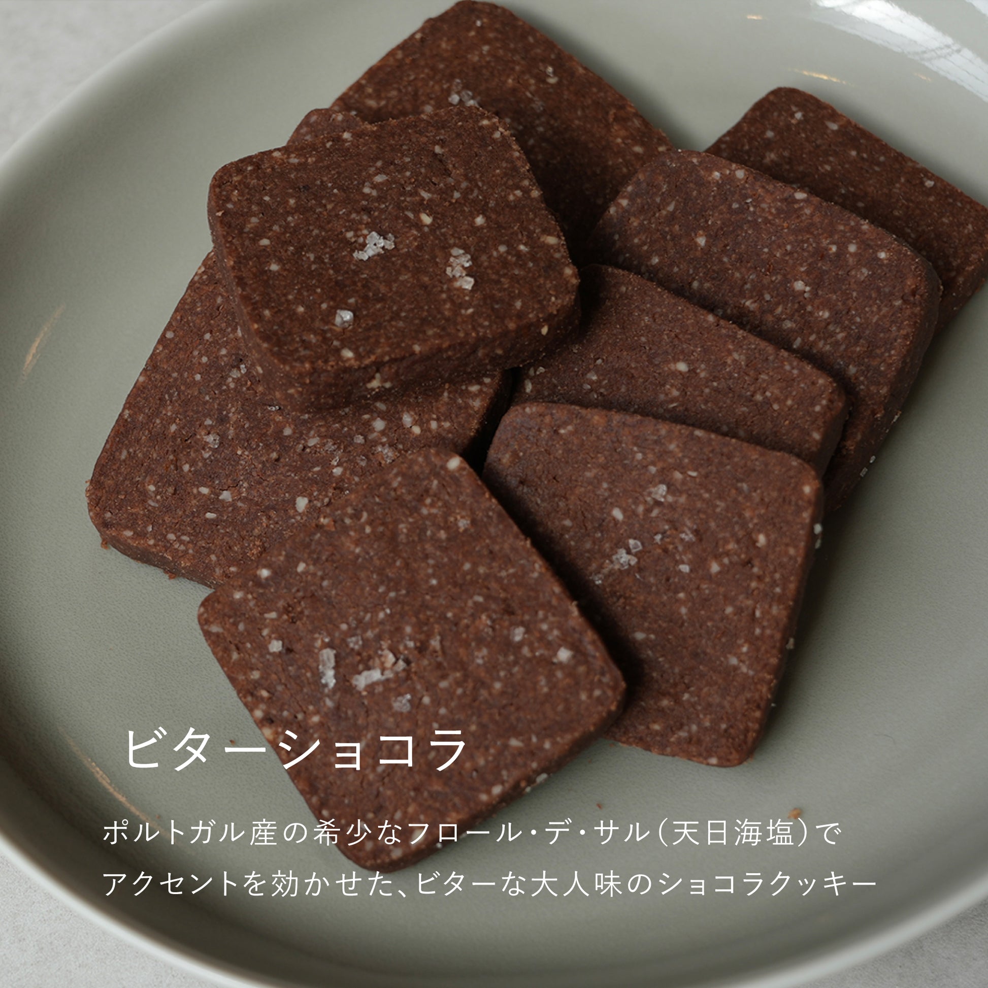 ポルトガル産の希少なフロール・デ・サル(天日海塩)でアクセントを抑えた、ビターな大人味のショコラクッキーです。